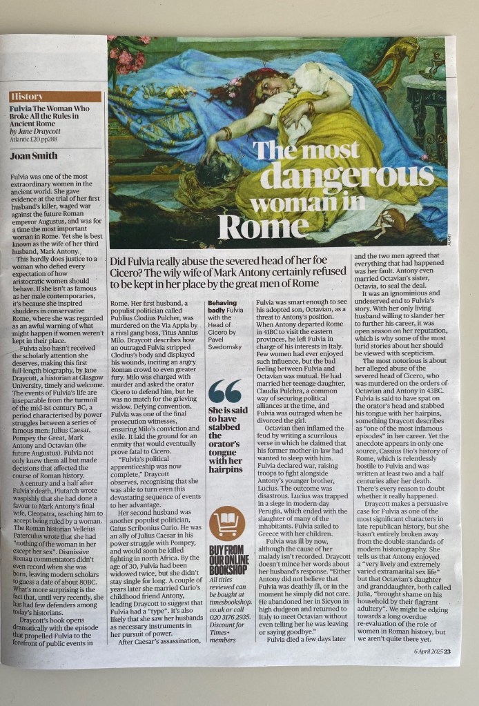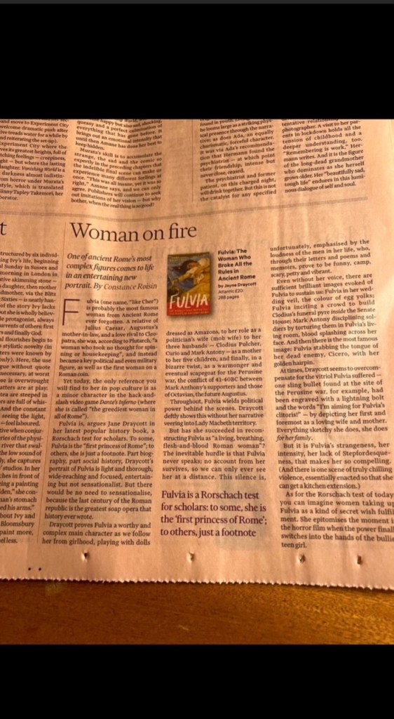My second popular history book, Fulvia: The Woman Who Broke All the Rules in Ancient Rome, is now available to buy in hardback, trade paperback, e-book, and audiobook format! It was published by Atlantic Books at the beginning of April in the UK and Northern Ireland, and I believe you can also order it from abroad and get it sent out to you. There is an exclusive signed edition available from Waterstones and Blackwell’s, and it was the Hatchard’s Non-fiction Book of the Month, and one of the World of Books Non-fiction Books of the Month in April. I am also signing copies whenever I happen to see them in bookshops, so keep your eyes peeled…